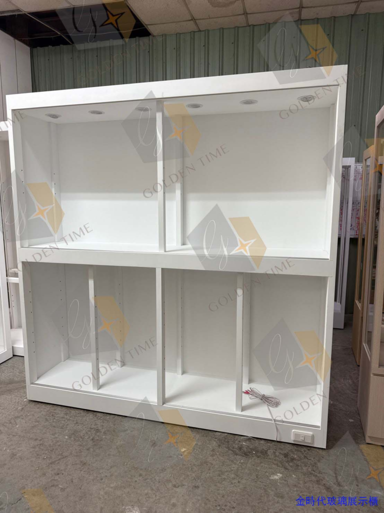 考量現場空間與運輸方便,採用分離式工法並於現場組裝。展示櫃擁有多層次、多分格的配置,可擺放多種尺寸展示品!!